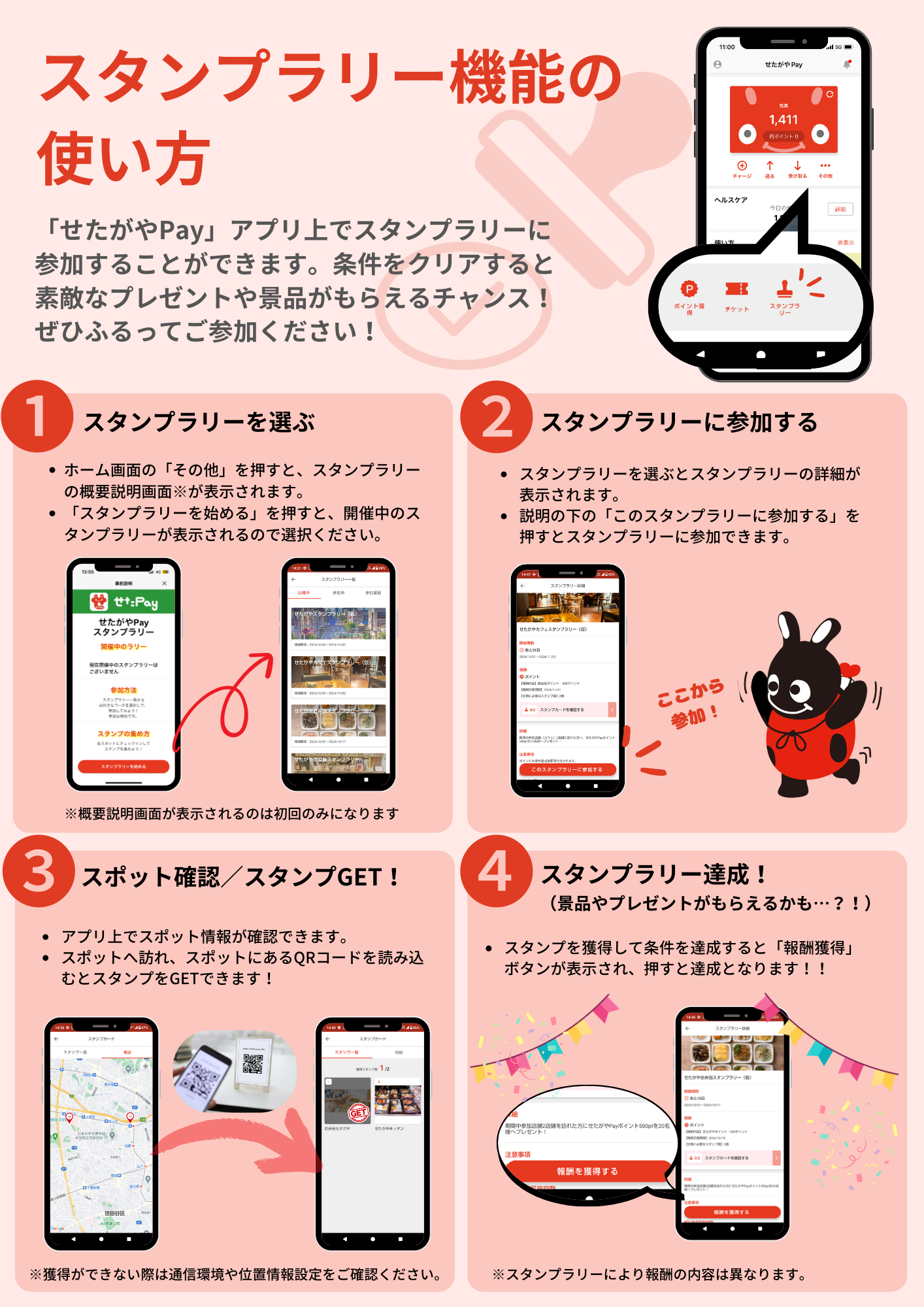 現在開催中のスタンプラリーへは、せたがやPayアプリトップ画面「その他」より「スタンプラリー」を選択してご参加ください。