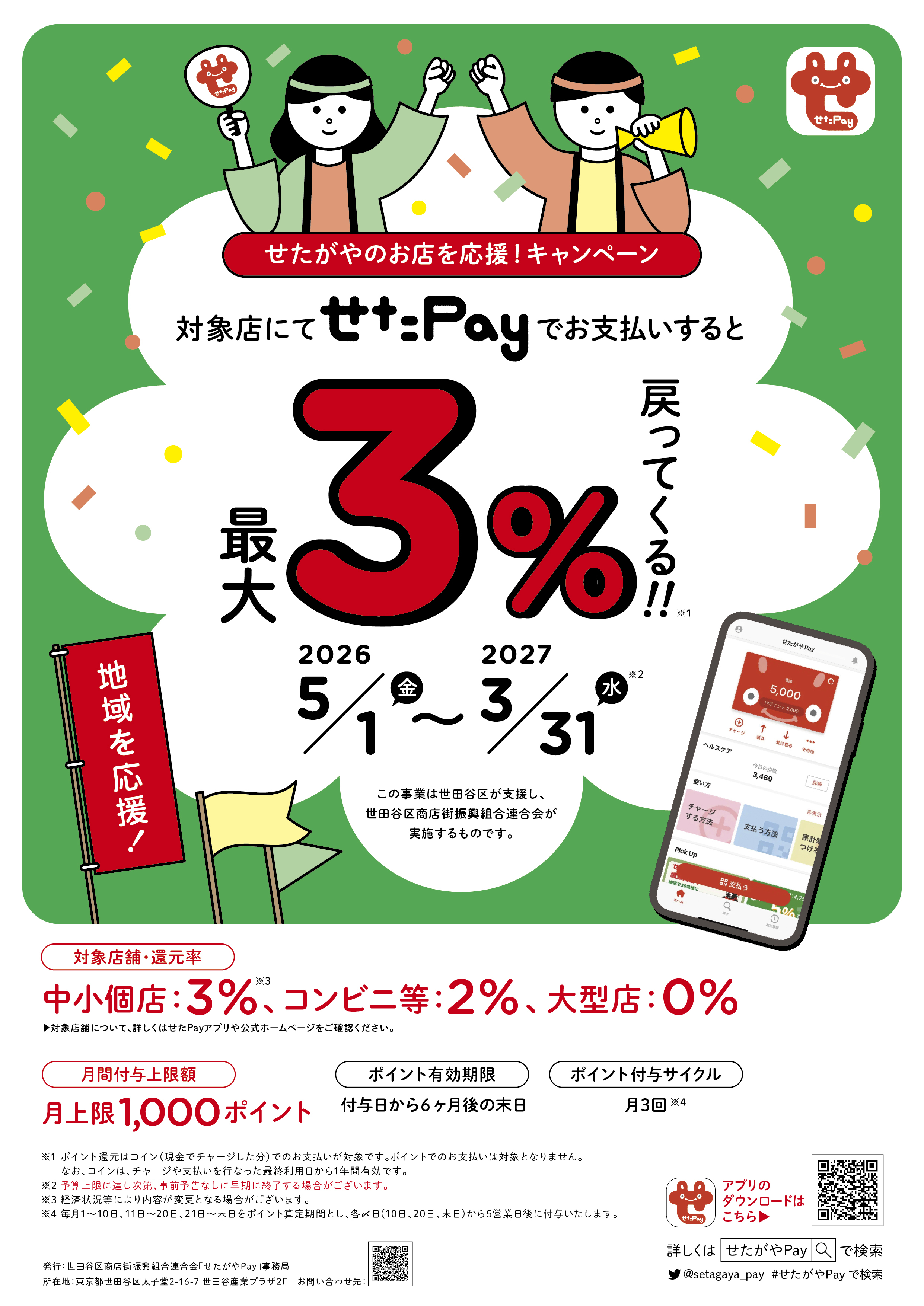 2026年(令和8年)5月1日(水)から、最大3%(月上限1,000ポイント)還元となる「せたがやのお店を応援!」を実施します。