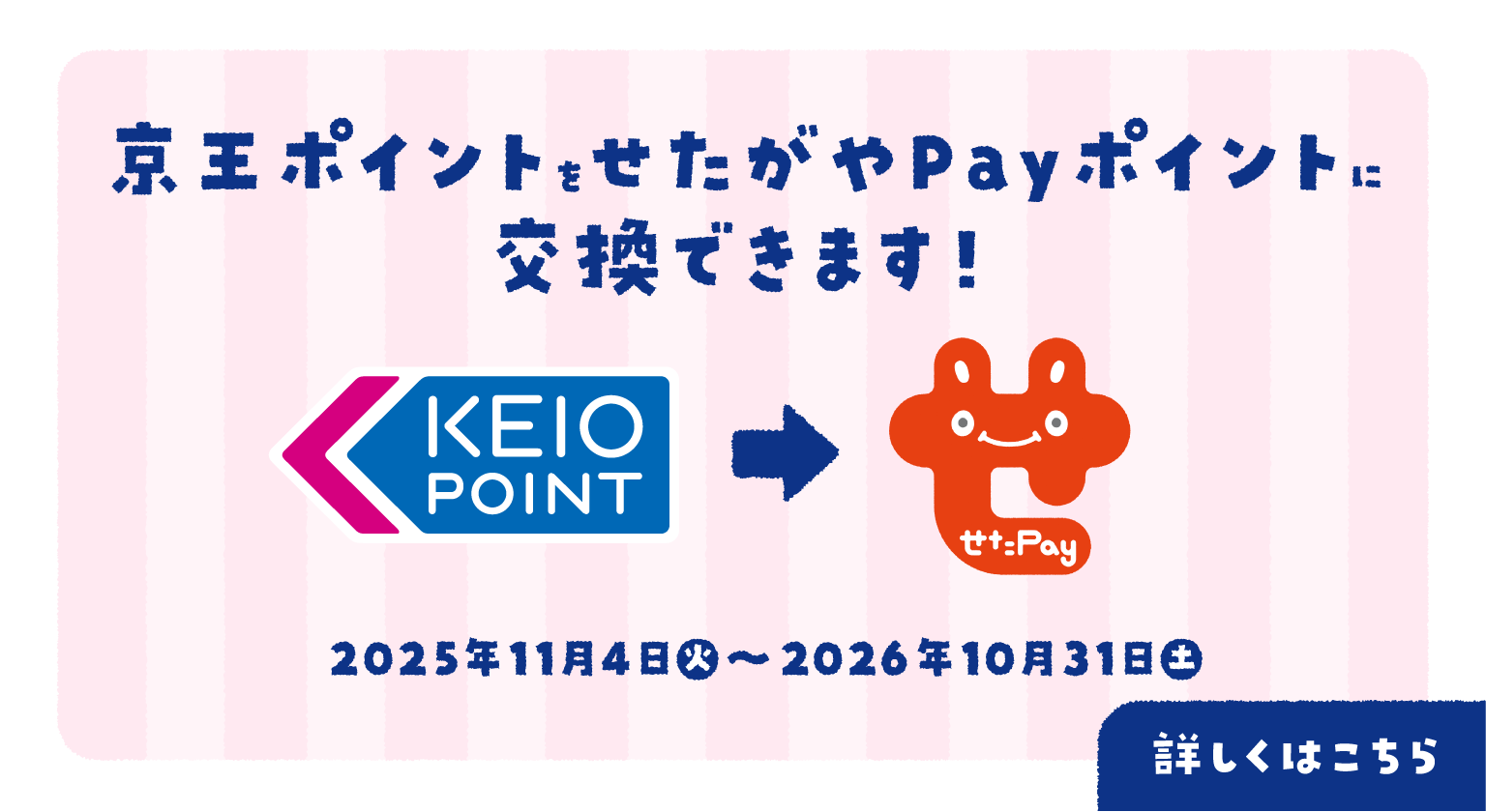 11月4日(火)から、期間限定で京王パスポートクラブの「京王ポイント」を、せたがやPayの全ての加盟店で使える「せたがやポイント」に交換できるようになりました!
